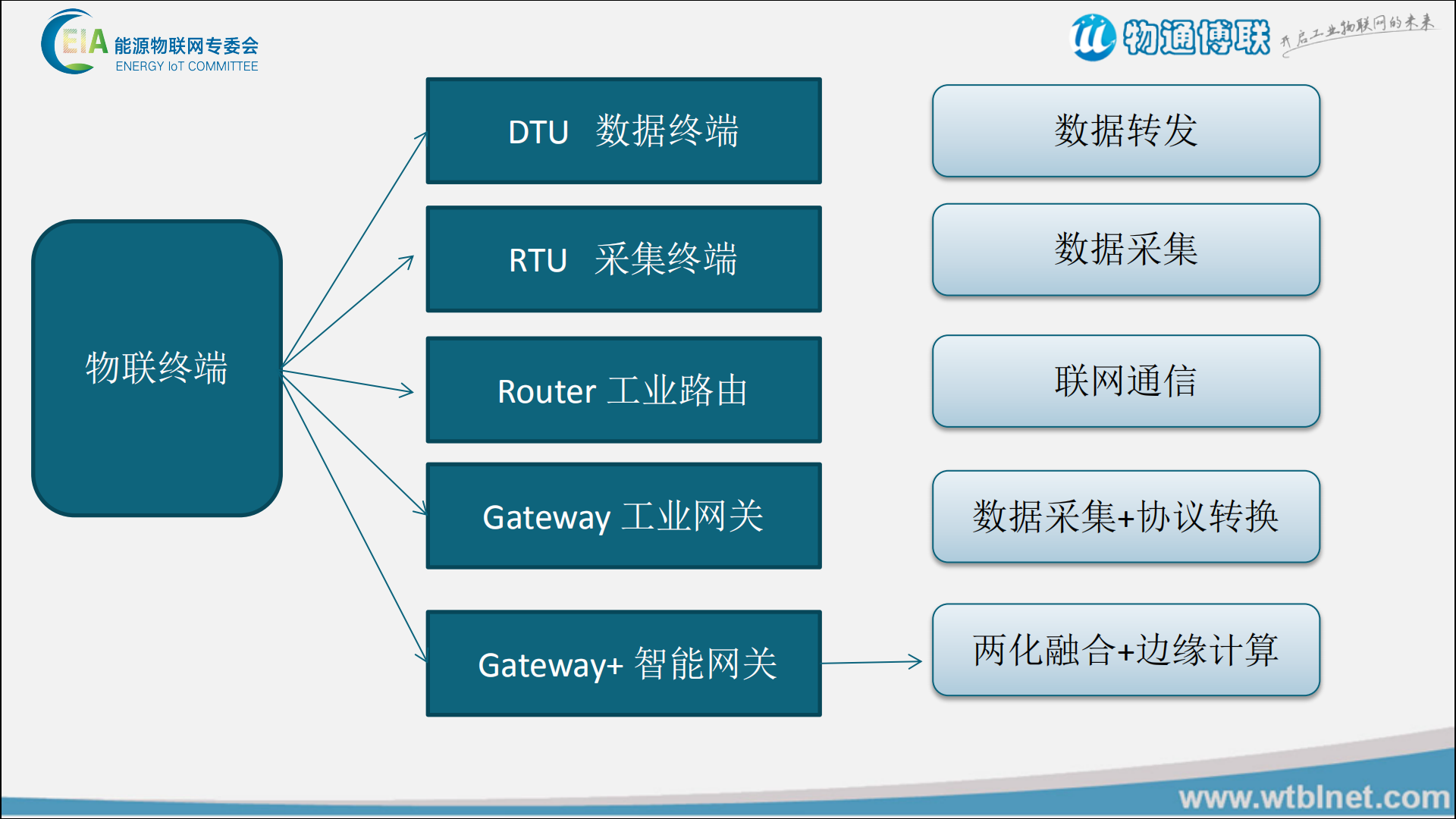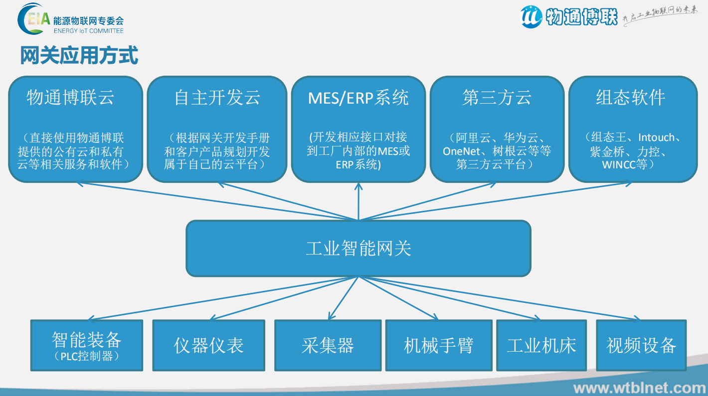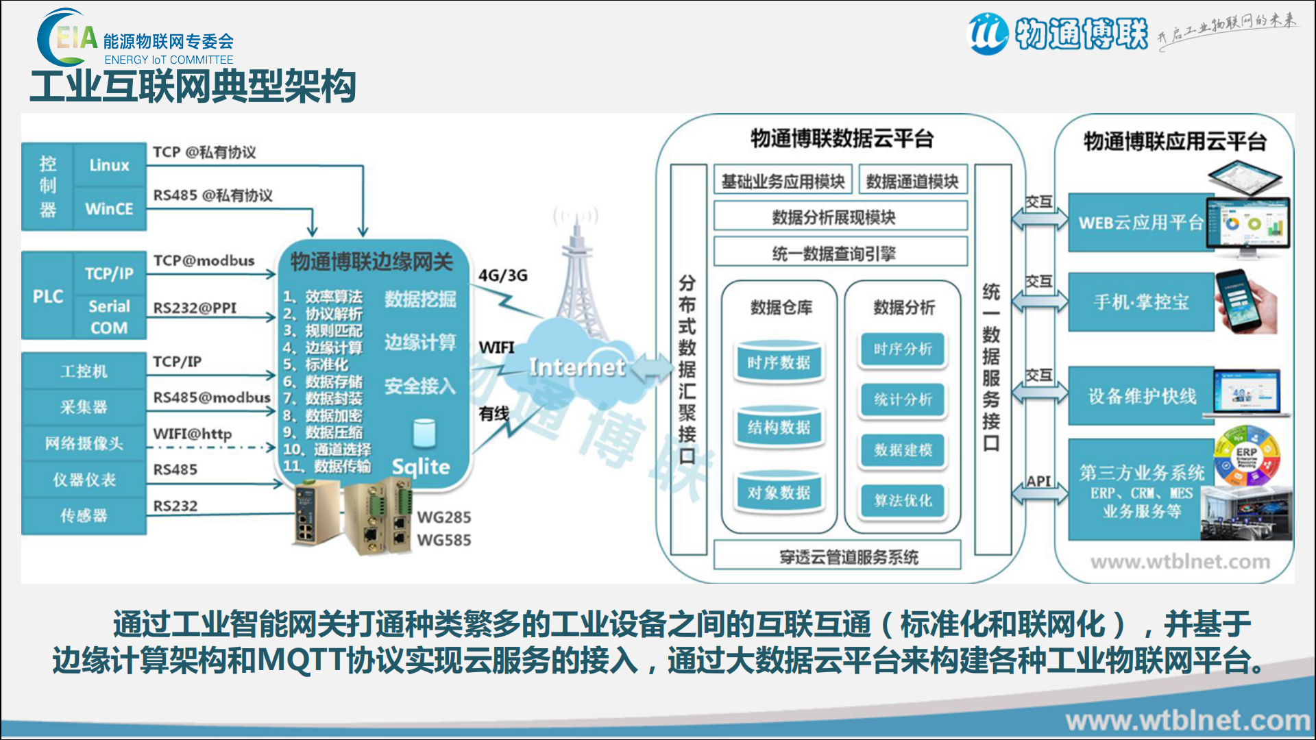 物通博聯(lián)·受邀國家能源互聯(lián)網(wǎng)產(chǎn)業(yè)及技術(shù)創(chuàng)新聯(lián)盟大講堂《能源物聯(lián)網(wǎng)》 時(shí)間:2020-09-02 17:22:22 2020年8月28日,物通博聯(lián)受邀國家能源互聯(lián)網(wǎng)產(chǎn)業(yè)及技術(shù)創(chuàng)新聯(lián)盟(CEIA)、CEIA能源物聯(lián)網(wǎng)專委會(huì)、CEIA能源數(shù)字化專委會(huì),做專場《能源互聯(lián)網(wǎng)的設(shè)備聯(lián)網(wǎng)方案與應(yīng)用》的演講。為能源領(lǐng)域的從業(yè)者分享關(guān)于能源互聯(lián)網(wǎng)領(lǐng)域的物聯(lián)網(wǎng)解決方案和物聯(lián)網(wǎng)產(chǎn)品。 2016年8月,國家能源局批復(fù)成立國家能源互聯(lián)網(wǎng)產(chǎn)業(yè)及技術(shù)創(chuàng)新聯(lián)盟(國能科技[2016]222號),由清華大學(xué)牽頭做好國家能源互聯(lián)網(wǎng)產(chǎn)業(yè)及技術(shù)創(chuàng)新聯(lián)盟的各項(xiàng)組織籌備工作。 物通博聯(lián)成立于2011年是國內(nèi)專注于工業(yè)4.0應(yīng)用、工業(yè)物聯(lián)網(wǎng)產(chǎn)品研發(fā)的高科技企業(yè),在能源互聯(lián)網(wǎng)也深耕多年,特別在國家電網(wǎng)、北方供熱和智能工廠信息化建設(shè)中有豐富的經(jīng)驗(yàn)和成功案例。 能源互聯(lián)網(wǎng)是新能源技術(shù)跟信息技術(shù)的深入結(jié)合為特征而催生的一種新的能源利用體系,它將能源生產(chǎn),能源消費(fèi)有機(jī)結(jié)合在一起。其中物聯(lián)是基礎(chǔ),采用先進(jìn)的傳感器、智能的工業(yè)網(wǎng)關(guān)、智慧化的控制和軟件系統(tǒng),將能源生產(chǎn)端、能源消費(fèi)端數(shù)以億計(jì)的設(shè)備、機(jī)器和系統(tǒng)連接起來,形成整套系統(tǒng);通過大數(shù)據(jù)、機(jī)器學(xué)習(xí)和預(yù)測提供能源效率和用能的利用率。 本次物通博聯(lián)演講主要從能源物聯(lián)網(wǎng)的需求分析、系統(tǒng)架構(gòu)、物聯(lián)產(chǎn)品和應(yīng)用案例四個(gè)方面進(jìn)行介紹分享。 能源是工業(yè)血液,伴隨工業(yè)4.0技術(shù)的應(yīng)用,能源互聯(lián)網(wǎng)也是重要組成部分。 典型的工業(yè)互聯(lián)網(wǎng)架構(gòu)(現(xiàn)場設(shè)備+工業(yè)網(wǎng)關(guān)+PASS平臺+SAAS平臺) 邊緣計(jì)算和云端計(jì)算協(xié)同,通過智能化的網(wǎng)關(guān)實(shí)現(xiàn)數(shù)據(jù)采集,通過智慧化的平臺實(shí)現(xiàn)分析 供熱系統(tǒng)的組成(熱源廠+換熱站+熱用戶) 電網(wǎng)的組成(發(fā)電+變電+配電+用電) 物聯(lián)網(wǎng)無線技術(shù)演進(jìn)(1G+2G+3G+4G+5G) 物聯(lián)網(wǎng)終端分類(Dtu->Rtu->Router->Gateway->Gatway+) 網(wǎng)關(guān)對接云平臺功能(物通博聯(lián)云平臺+自主開發(fā)云平臺、MES平臺、阿里平臺、組態(tài)王) 物通博聯(lián)·物聯(lián)網(wǎng)終端的介紹: 工業(yè)云網(wǎng)關(guān)(各種設(shè)備數(shù)據(jù)采集、4G/WIFI/以太網(wǎng)/5G /LORA聯(lián)網(wǎng),各種云平臺接入) 邊緣計(jì)算網(wǎng)關(guān)(邊緣計(jì)算、PLC數(shù)采、電表數(shù)集、水表數(shù)采、電力設(shè)備數(shù)采、IO采集) 物通博聯(lián)是一家工業(yè)智能化產(chǎn)品及應(yīng)用服務(wù)提供商,專注于為設(shè)備制造商、智能工廠及行業(yè)項(xiàng)目等領(lǐng)域提供智能網(wǎng)關(guān)、設(shè)備快線及應(yīng)用云平臺產(chǎn)品及方案。憑借在兩化融合、設(shè)備聯(lián)網(wǎng)、邊緣計(jì)算、大數(shù)據(jù)分析及工業(yè)建模等核心技術(shù)的積淀和優(yōu)勢,物通博聯(lián)作為工業(yè)4.0的先行者,產(chǎn)品得到國內(nèi)外頂級客戶和廣大中小企業(yè)的青睞,為客戶提供整體智能化解決方案,協(xié)助客戶實(shí)現(xiàn)數(shù)字化運(yùn)營管理和工業(yè)互聯(lián)網(wǎng)新價(jià)值挖掘。 附: 【CEIA能源互聯(lián)網(wǎng)大講堂】第37期 回放視頻 演講主題:能源互聯(lián)網(wǎng)的設(shè)備物聯(lián)網(wǎng)方案及應(yīng)用 演講嘉賓:廈門物通博聯(lián)網(wǎng)絡(luò)科技有限公司 劉明德 視頻鏈接:https://v.qq.com/x/page/a3145t8271l.html 內(nèi)容大綱: 1、能源互聯(lián)網(wǎng)的需求分析 2、能源互聯(lián)網(wǎng)的系統(tǒng)架構(gòu) 3、能源互聯(lián)網(wǎng)的產(chǎn)品介紹 4、能源互聯(lián)網(wǎng)的應(yīng)用分享 上一篇:物通博聯(lián)作為工業(yè)互聯(lián)網(wǎng)先行者,受邀參加2020數(shù)字中國峰會(huì)及《工業(yè)互聯(lián)網(wǎng)論壇》 下一篇: 物通博聯(lián)在廈門兩岸股權(quán)交易中心 “閩西南科技板”成功掛牌 相關(guān)推薦 賦能工業(yè)數(shù)據(jù)安全-物通博聯(lián)通過DSMM數(shù)據(jù)安全能力成熟度三級認(rèn)證 2025-12-06 【展會(huì)邀請】物通博聯(lián)與您相約2025越南工業(yè)及制造業(yè)博覽會(huì) 2025-10-20 數(shù)據(jù)驅(qū)動(dòng),智造未來丨萬暉五金設(shè)備數(shù)采項(xiàng)目啟動(dòng)會(huì)圓滿舉行 2025-09-19 向新求質(zhì)|物通博聯(lián)獲評2024發(fā)展新質(zhì)生產(chǎn)力“影響力企業(yè)”,總經(jīng)理劉明德獲評2024發(fā)展新質(zhì)生產(chǎn)力“領(lǐng)軍人物” 2025-04-25 相關(guān)產(chǎn)品 工業(yè)智能網(wǎng)關(guān) 物通博聯(lián)·WG系列工業(yè)智能網(wǎng)關(guān)是一款支持采集各種PLC,儀器儀表,水環(huán)保,電力設(shè)備,CNC等各種