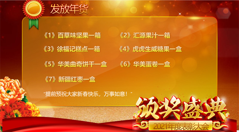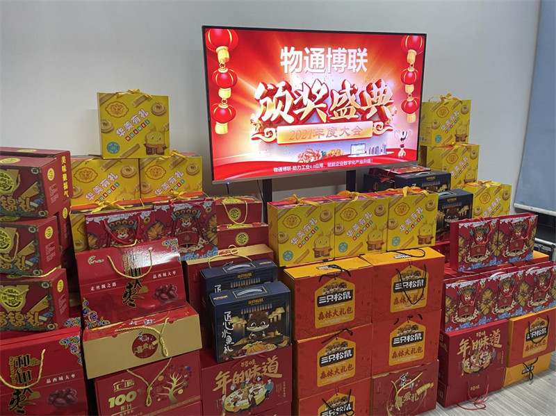 2、物通博聯(lián)為每個員工準備了豐盛的年貨和晚宴,每個人人均10箱的年貨。