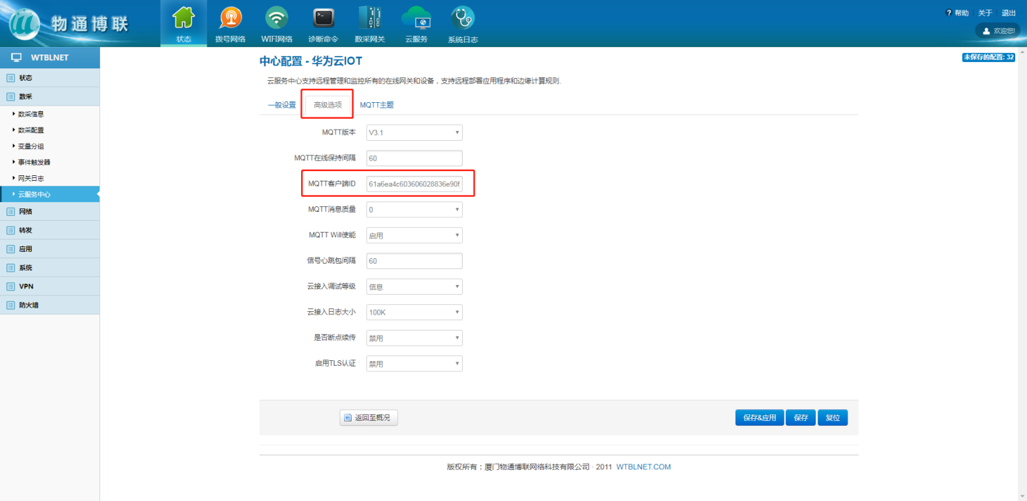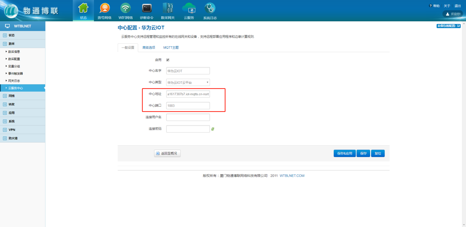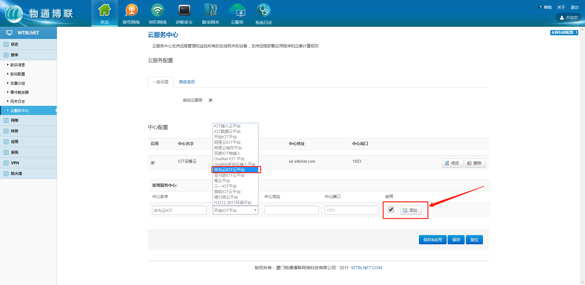 在網(wǎng)關(guān)本地web界面內(nèi),左側(cè)目錄欄中選擇數(shù)采,下拉框中的云服務(wù)中心來配置網(wǎng)關(guān)與華為云IOT的MQTT連接參數(shù),中心類型選擇華為云IOT平臺(tái),并勾選啟用,點(diǎn)擊添加。