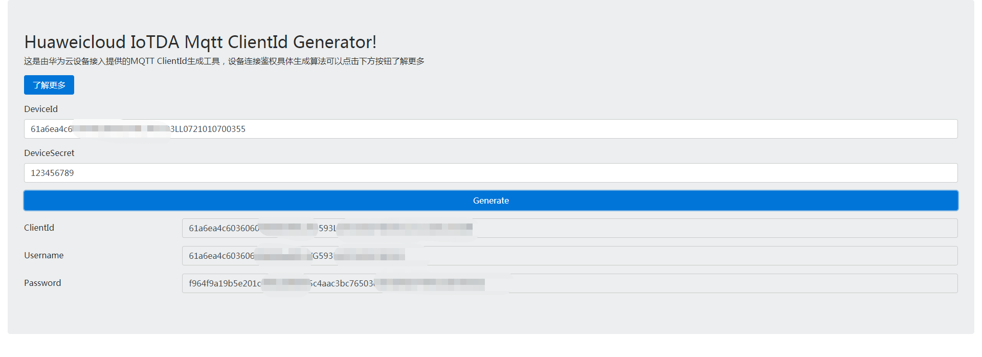 通過以下鏈接生成連接所需的用戶名、密碼和ClientID:https://iot-tool.obs-website.cn-north-4.myhuaweicloud.com/