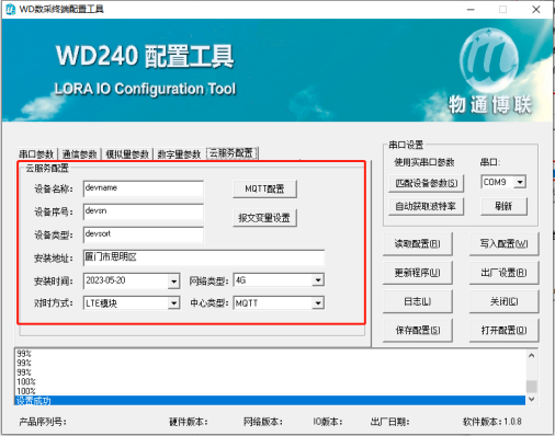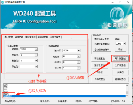 可以通過配置工具修改WD140設(shè)備的串口參數(shù)以及通訊參數(shù)(相關(guān)配置的說明請(qǐng)繼續(xù)閱讀此文檔),修改完成后點(diǎn)擊“寫入配置”,等待下方提示寫入成功后即可。