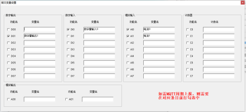 注:如果需要配置串口數(shù)據(jù)透?jìng)鞯組QTT服務(wù)器,只需要在上下行主題加入“trans”字樣即可,主題中含有“trans”即代表網(wǎng)關(guān)為透?jìng)髂J?。配置好MQTT參數(shù)后,關(guān)閉子窗口,點(diǎn)擊“報(bào)文變量設(shè)置”,可自定義變量名稱,可按需設(shè)置需要上報(bào)的點(diǎn)位,在需要上報(bào)的點(diǎn)位名稱前面打鉤即可,如下圖: