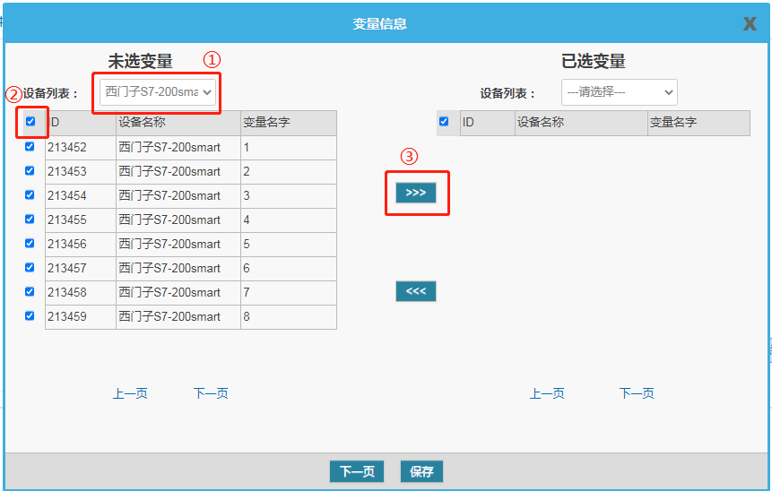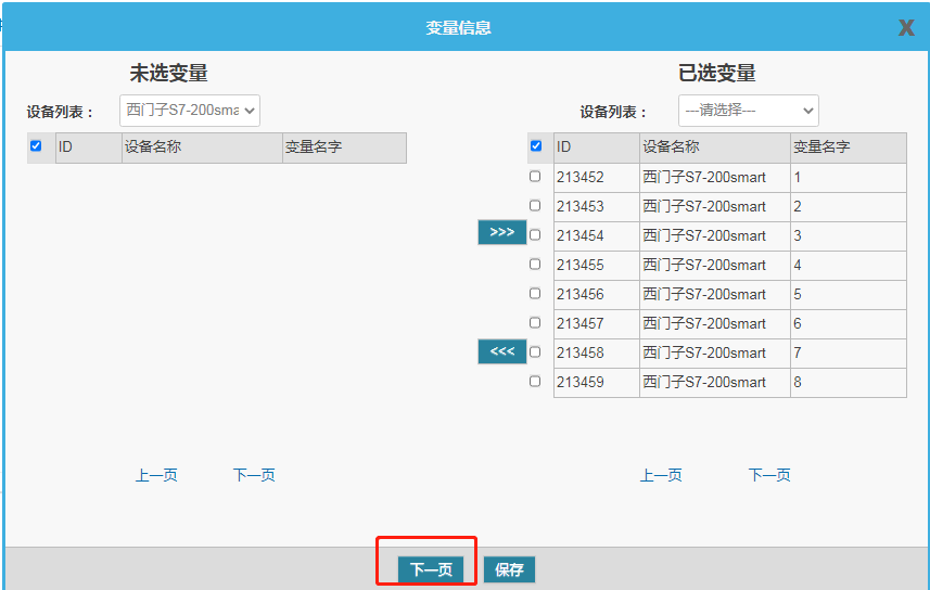 從“未選變量”列表中選擇對應(yīng)要轉(zhuǎn)發(fā)的設(shè)備變量,轉(zhuǎn)到“已選變量”中,點(diǎn)擊下一頁。