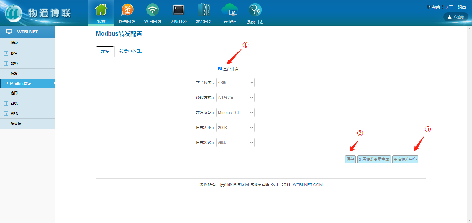 P.s.轉(zhuǎn)發(fā)運(yùn)行出現(xiàn)異常時(shí),請將日志狀態(tài)調(diào)整為“調(diào)試”,可打印具體日志,下載轉(zhuǎn)發(fā)日志發(fā)送至物通博聯(lián)技術(shù)支持工程師處診斷。為了保證網(wǎng)關(guān)快速高效轉(zhuǎn)發(fā),調(diào)試完畢后請務(wù)必將日志等級(jí)調(diào)整為信息。