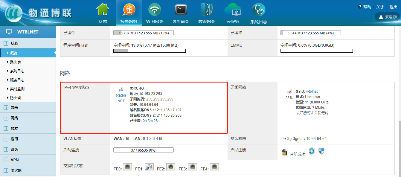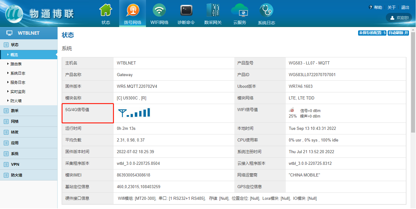 通常支持5G/4G/3G上網(wǎng)的網(wǎng)絡(luò)隔離器的出廠配置是5G/4G/3G流量卡上網(wǎng)的模式,使用上電前將流量卡、天線(5G/4G/3G天線延長線的SMA頭是針,網(wǎng)絡(luò)隔離器上的連接頭是孔)裝上就可以了。也可以進(jìn)入網(wǎng)絡(luò)隔離器的WEB界面,查看5G/4G/3G信號值以及5G/4G/3G網(wǎng)絡(luò)聯(lián)網(wǎng)情況,如下圖: