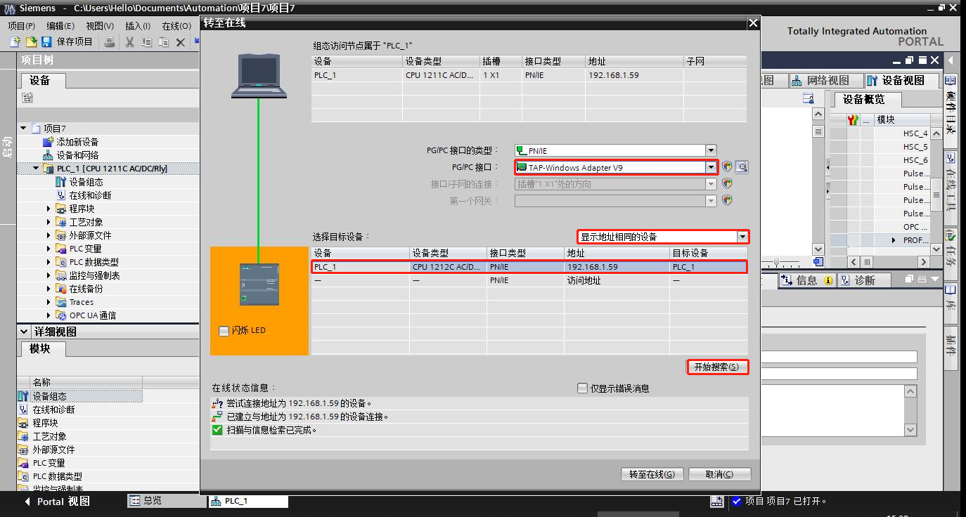 2、在線連接,選擇PN/IE接口類型,“TAP Windows Adapter V9”接口,選擇顯示地址相同的設(shè)備-在顯示列表中手動輸入設(shè)備的IP地址-點擊開始搜索。