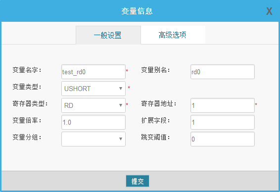 變量配置主要是定義變量名(自定義內(nèi)容,不可使用中文命名)、變量別名(自定義,可使用中文名字)、寄存器類型和寄存器偏移地址,并定義一些數(shù)據(jù)規(guī)則(如:倍率、小數(shù)點、單位、告警)。