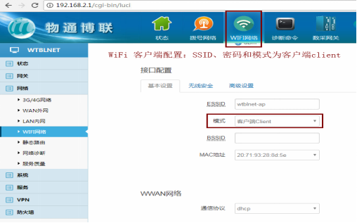 模式:客戶端Client(通過WiFi上外網(wǎng)請選擇client模式,如果是共享WiFi給其他設備請選擇AP模式)