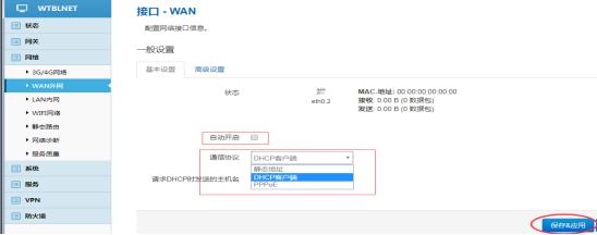 勾選自動開啟,選擇通信協(xié)議(靜態(tài)地址、DHCP客戶端、PPPOE,三選一),保存&應用。