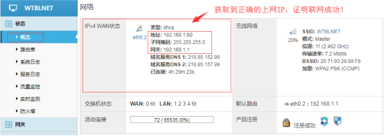 P.s.驗證網(wǎng)關已聯(lián)網(wǎng)情況:狀態(tài)-概率-網(wǎng)絡-IPV4WAN狀態(tài)---獲取到IP地址
