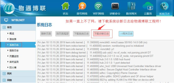 如果通過如上設置還是沒辦法上網(wǎng),請下載診斷日志,然后發(fā)給物通博聯(lián)工程師;我們工程師會根據(jù)系統(tǒng)日志診斷問題并提出指導建議。