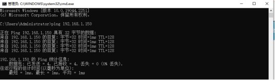 1、將PLC與網(wǎng)關通過LAN口相連接,通過設備快線(維護通道搭建成功后)在遠程電腦上使用cmdpingPLC的IP地址(192.168.1.150為PLC的IP地址)