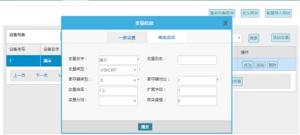 變量配置主要是定義變量名(自定義內(nèi)容,不可使用中文命名)、變量別名(自定義,可使用中文名字)、寄存器類型和寄存器偏移地址,并定義一些數(shù)據(jù)規(guī)則(如:倍率、小數(shù)點(diǎn)、單位、告警)。