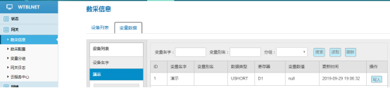 數(shù)采配置(設(shè)備信息+變量參數(shù))完成后,重啟采集程序并生效配置,即可在:數(shù)采信息---變量數(shù)據(jù)---設(shè)備名稱中看到采集上來(lái)的數(shù)據(jù)。