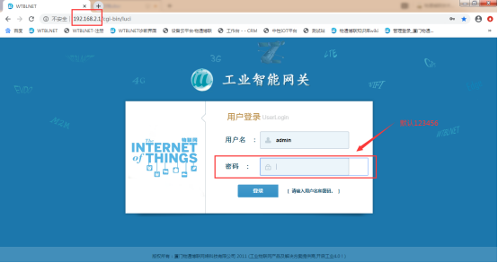 打開(kāi)瀏覽器輸入網(wǎng)關(guān)地址192.168.2.1,登錄密碼默認(rèn)為123456(如有修改請(qǐng)按實(shí)際填寫)