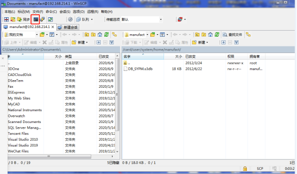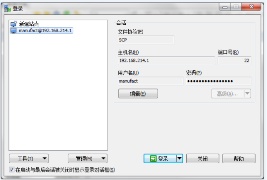 第二步:打開WinSCP軟件,將文件協(xié)議配置為SCP,主機IP:192.168.214.1 端口號:22,用戶名manufact,密碼大寫:SUNRISE。
