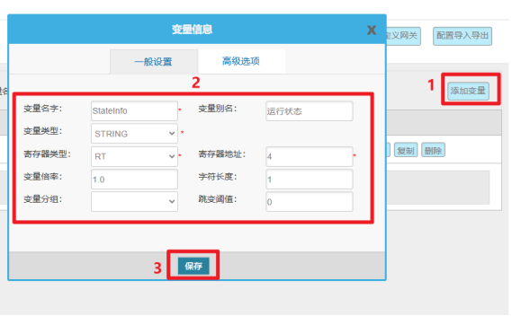 變量配置主要是定義變量名(自定義內(nèi)容,不可使用中文命名)、變量別名(自定義,可使用中文名字)、寄存器類型和寄存器偏移地址,并定義一些數(shù)據(jù)規(guī)則(如:倍率、小數(shù)點、單位、告警)。