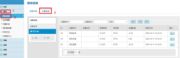 數(shù)采配置(設(shè)備信息+變量參數(shù))完成后,重啟采集程序并生效配置即可在:數(shù)采信息---變量數(shù)據(jù)---設(shè)備名稱 中看到采集上來的數(shù)據(jù)。