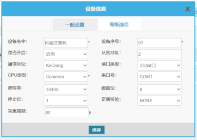 輸入設(shè)備名稱(任意),設(shè)備序號(hào)(任意,注意同一網(wǎng)關(guān)下的設(shè)備序號(hào)不能重復(fù)),從站地址(設(shè)備站號(hào)),通信協(xié)議(KeQiang,根據(jù)注塑機(jī)型號(hào)選擇),接口類型(232串口),串口號(hào)(連接網(wǎng)關(guān)端串口號(hào)),以及串口參數(shù)(一般注塑機(jī)默認(rèn)波特率是38400,數(shù)據(jù)位8,無(wú)校驗(yàn),停止位1),采集周期根據(jù)自身需求設(shè)置,然后點(diǎn)擊保存。