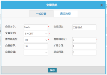 填寫點(diǎn)位相關(guān)信息,變量名(任意),變量別名(任意),變量類型(根據(jù)點(diǎn)位數(shù)據(jù)類型選擇,具體可查看網(wǎng)關(guān)支持的數(shù)據(jù)類型),寄存器類型(固定選擇RT)以及寄存器地址(按照注塑機(jī)點(diǎn)位表填寫,例如工作模式對(duì)應(yīng)寄存器地址0),然后點(diǎn)擊保存。