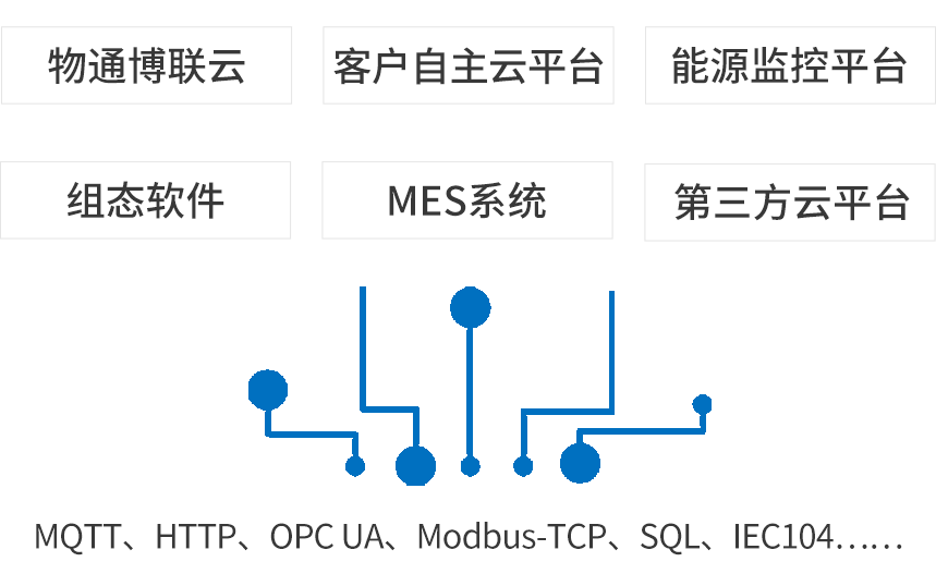 北向支持接入物通博聯(lián)云平臺,客戶自主開發(fā)的云平臺,第三方云平臺(根云、美云、華為、阿里、百度、微軟等IOT云平臺),能源監(jiān)控平臺等