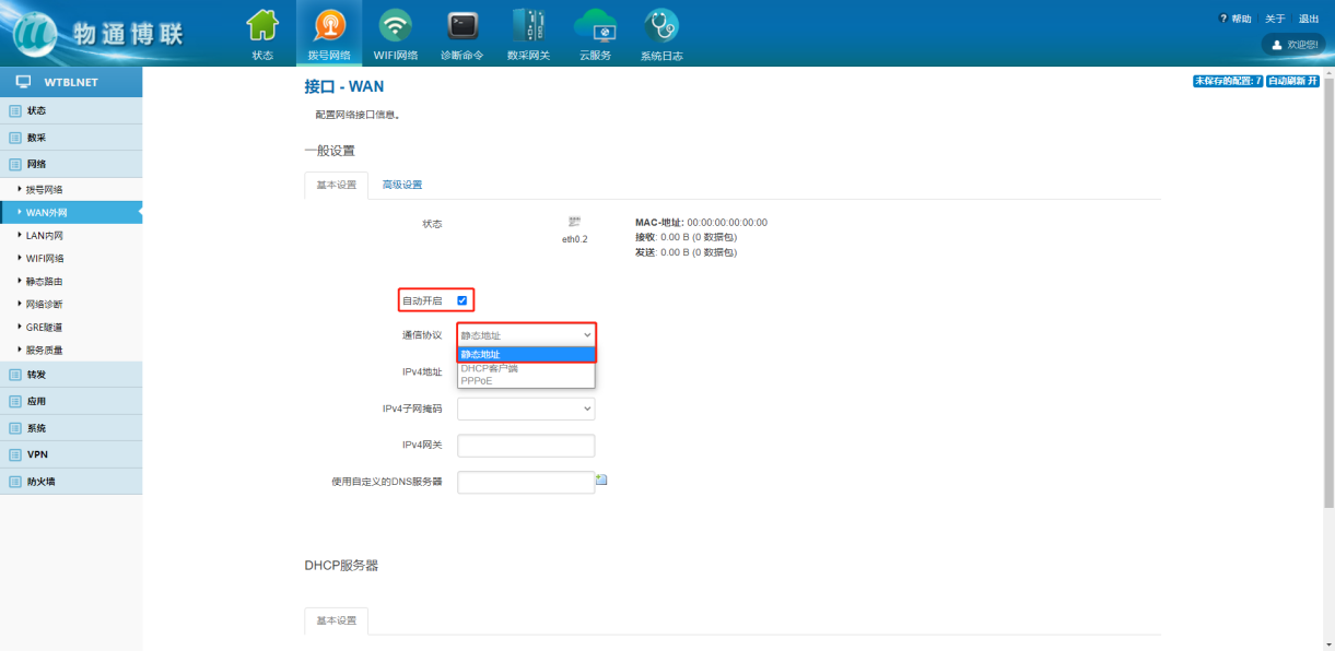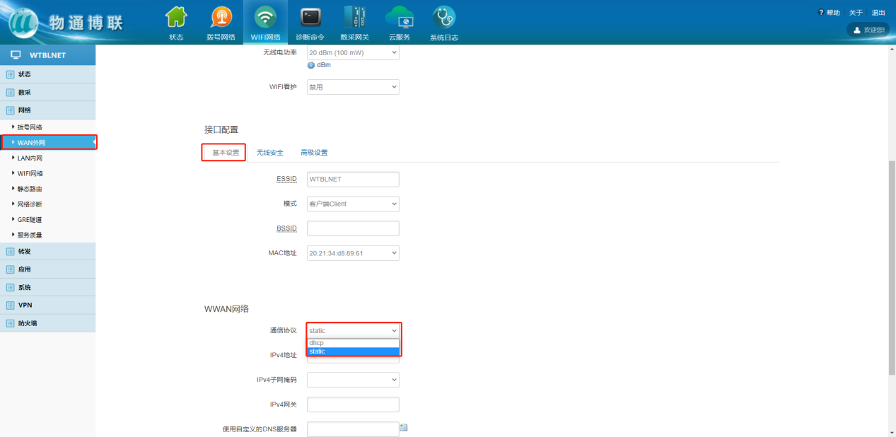 下載中心 視頻中心 常見問題 售后服務(wù) 工業(yè)網(wǎng)關(guān) 設(shè)備快線 數(shù)據(jù)云平臺 聯(lián)網(wǎng)設(shè)備 問答百科 工業(yè)智能網(wǎng)關(guān)如何設(shè)置靜態(tài)固定IP? 時間:2022-10-26 09:15:30 點擊:6792 關(guān)鍵詞:工業(yè)智能網(wǎng)關(guān),靜態(tài)固定IP,網(wǎng)關(guān)配置 問題:工業(yè)智能網(wǎng)關(guān)如何設(shè)置靜態(tài)固定IP? 回答: (1)WAN外網(wǎng)設(shè)置靜態(tài)IP 網(wǎng)絡(luò)—WAN外網(wǎng)—切換通信協(xié)議——填寫固定IP參數(shù) (2)WiFi網(wǎng)絡(luò)設(shè)置靜態(tài)IP 網(wǎng)絡(luò)—WiFi網(wǎng)絡(luò)—修改—切換通信協(xié)議—填寫靜態(tài)IP 上一篇:工業(yè)智能網(wǎng)關(guān)如何使用網(wǎng)線上網(wǎng)? 下一篇: 工業(yè)智能網(wǎng)關(guān)如何進(jìn)行軟硬件復(fù)位?