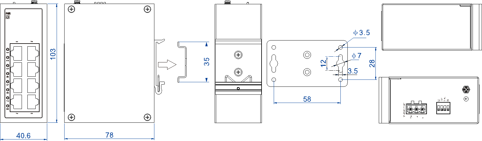 外殼:IP40防護(hù)等級(jí),金屬外殼 安裝:DIN導(dǎo)軌式或壁掛式安裝 尺寸(寬×高×深):40.6mm×103mm×78mm |
