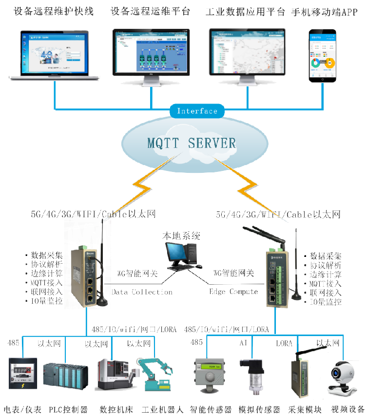 物通博聯(lián)工業(yè)RS485串口網(wǎng)關(guān)內(nèi)置豐富的工控協(xié)議,支持各種PLC、儀器儀表、CNC機床、環(huán)保設(shè)備、電力設(shè)備、非標(biāo)設(shè)備等,支持Modbus RTU 協(xié)議、Modbus TCP 協(xié)議、 OPC UA、 MQTT 協(xié)議,DLT645、IEC104等等,方便用戶快速把多種工業(yè)設(shè)備接入物聯(lián)網(wǎng)云平臺如:物通博聯(lián)云,百度云、根云、華為云、AWS IoT、阿里云等云平臺,同時也可以接入SCADA、MES、BAS、ERP 等上位機數(shù)據(jù)處理系統(tǒng),數(shù)據(jù)可以同步傳輸給云平臺和上位機系統(tǒng)。