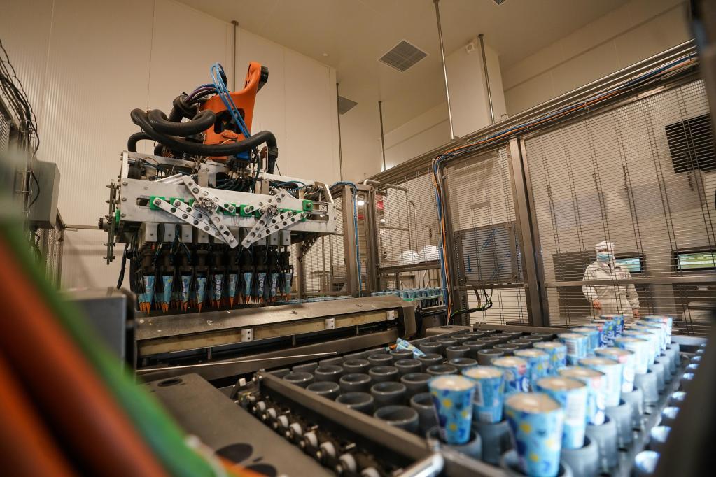 位于江蘇蘇州太倉(cāng)的聯(lián)合利華和路雪生產(chǎn)基地,于2021年9月獲評(píng)全球“燈塔工廠”,成為當(dāng)?shù)?ldquo;智能制造”的標(biāo)桿。工廠里,機(jī)器人正將產(chǎn)品轉(zhuǎn)移到速凍隧道。新華社記者 季春鵬 攝