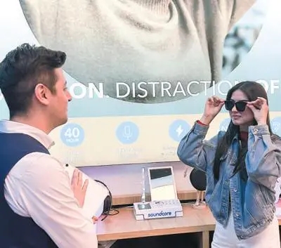消費(fèi)者在體驗(yàn)安克創(chuàng)新帶有骨傳導(dǎo)耳機(jī)功能的墨鏡產(chǎn)品。 穆罕默德·喬杜里攝