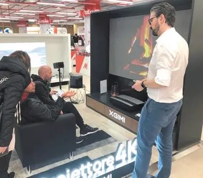 消費(fèi)者在極米科技位于意大利米蘭一家電器商場的快閃店體驗(yàn)投影儀產(chǎn)品。 鄒 成攝