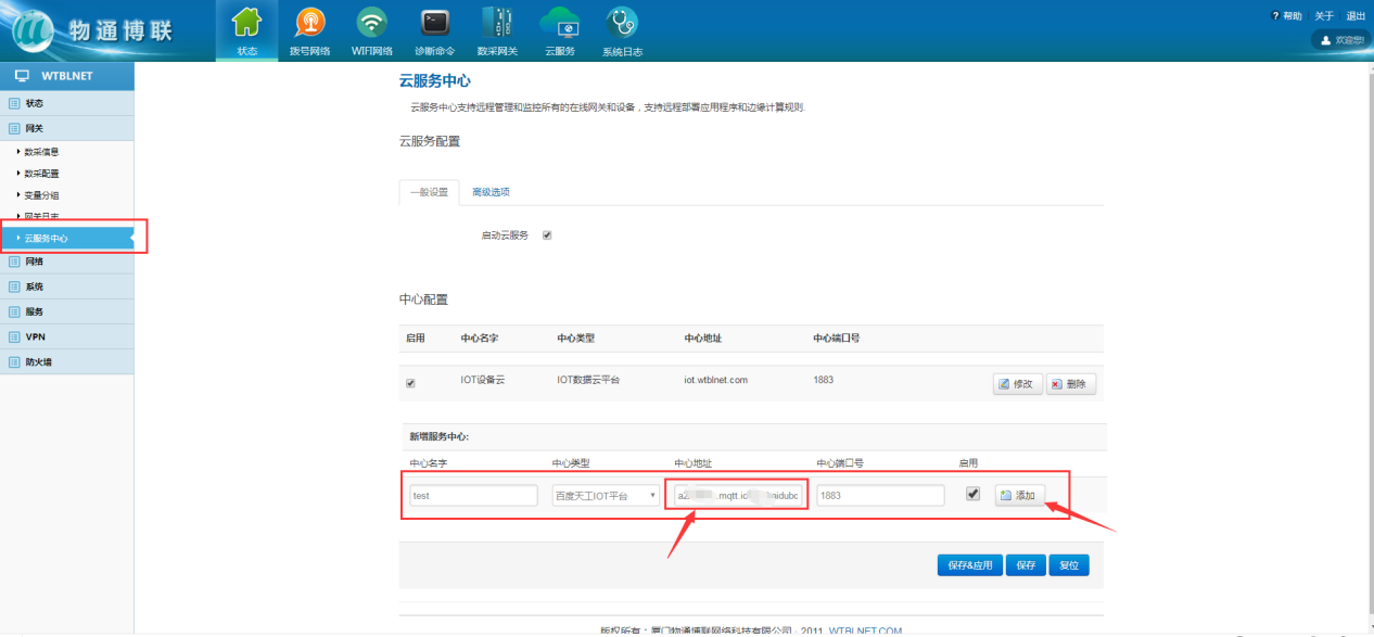 在網(wǎng)關(guān)的云服務(wù)中心中添加百度天工IOT云平臺,建立與百度天工IOT云平臺的連接,并將采集到的數(shù)據(jù)上傳到云平臺。