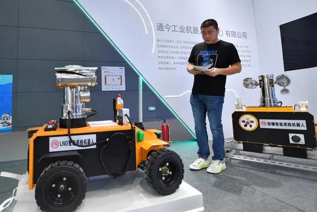 9月7日,參觀者在本屆數(shù)博會上參觀LNG智能巡檢機(jī)器人。新華社記者 駱學(xué)峰 攝
