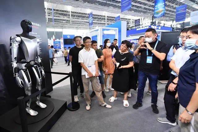 9月7日,參觀者在數(shù)博會上與人形機器人握手。 新華社記者 駱學峰 攝