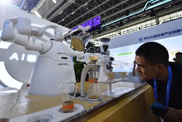 9月6日,參觀者在數(shù)博會上觀看AI咖啡手沖機器人制作咖啡。 新華社記者 駱學峰 攝