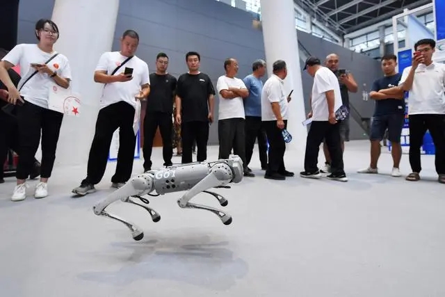 9月8日,參觀者在數(shù)博會上觀看四足機器人表演。 新華社記者 駱學峰 攝