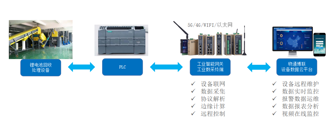 通過將物通博聯(lián)邊緣計算網(wǎng)關(guān)接入鋰電池資源化回收處理設(shè)備的PLC、傳感器等設(shè)備,可以進行數(shù)據(jù)采集和實時通信,從而實現(xiàn)遠程監(jiān)控、故障報警、運維管理、遠程維護、數(shù)據(jù)分析等多種智能功能,能夠幫助企業(yè)快速覺察設(shè)備故障并及時維護,確保生產(chǎn)安全與生產(chǎn)效率,促進持續(xù)性綠色生產(chǎn)。