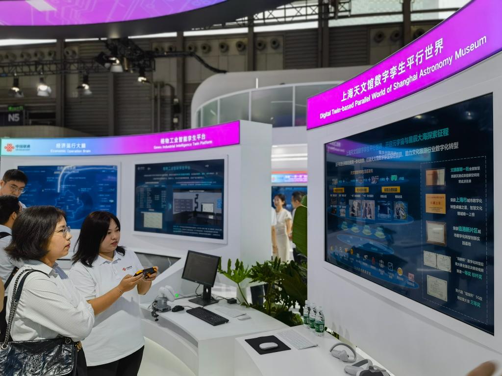 6月26日,觀眾在中國聯(lián)通展臺體驗“上海天文館數(shù)字孿生平行世界”。新華社記者 陳愛平 攝