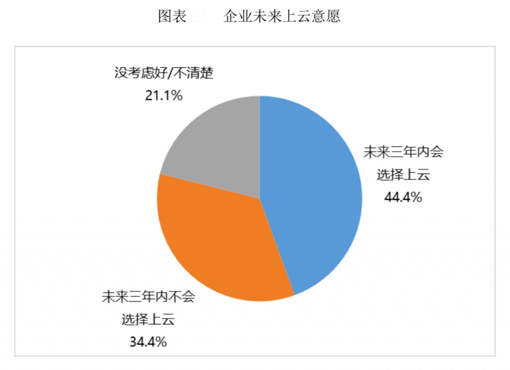 在沒(méi)有選用云服務(wù)的企業(yè)用戶中,超越40%的企業(yè)計(jì)劃在未來(lái)三年內(nèi)開(kāi)端選用云服務(wù)模式,未上云企業(yè)依然存在比較強(qiáng) 的上云志愿,全體來(lái)看,我國(guó)企業(yè)事務(wù)上云還處于起步階段,未來(lái)的商場(chǎng)潛力巨大。