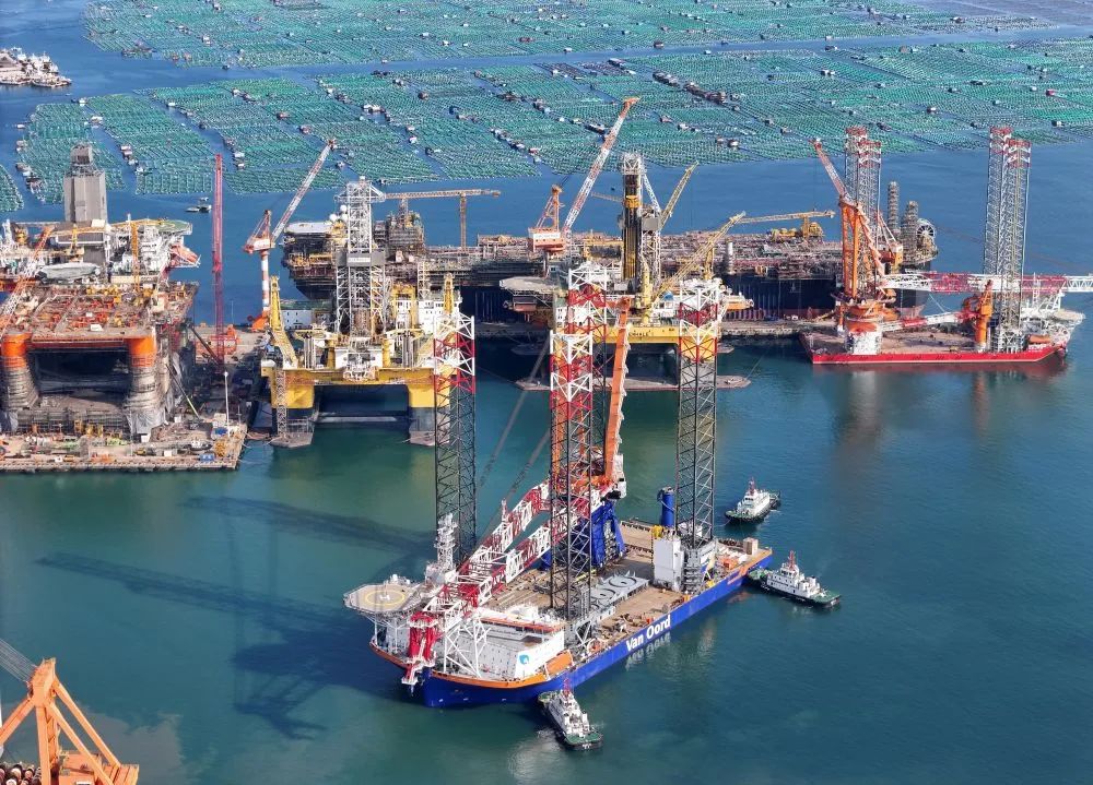 在中集來福士山東煙臺建造基地,多型海工裝備和特種船舶在進行建造和測試(10月16日攝,無人機照片)。新華社發(fā)(唐克攝)