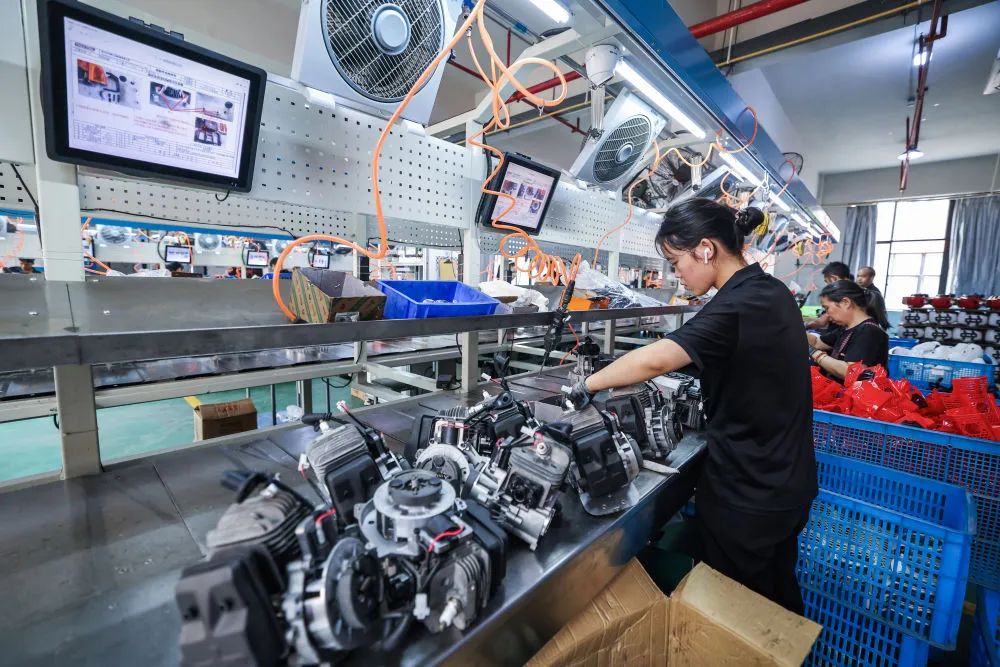 2024年8月14日,在位于金華市的浙江托馬斯工具制造有限公司數(shù)字化車間內(nèi),工人在流水線上生產(chǎn)出口的園林機械。新華社記者 徐昱 攝
