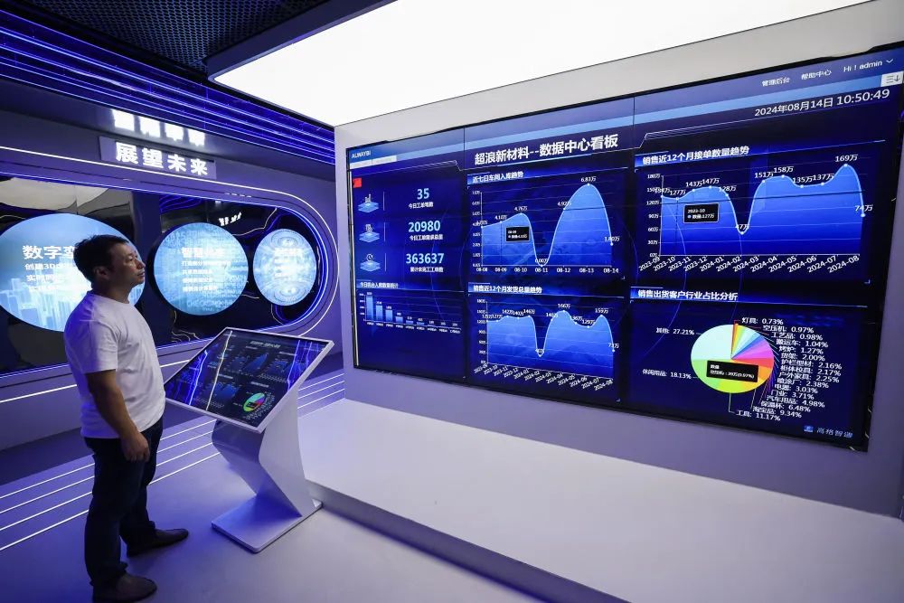 8月14日,在金華市金東區(qū)江東鎮(zhèn)的浙江超浪新材料有限公司內(nèi),數(shù)據(jù)中心看板實時顯示企業(yè)流水線的各項生產(chǎn)數(shù)據(jù)。新華社記者 徐昱 攝