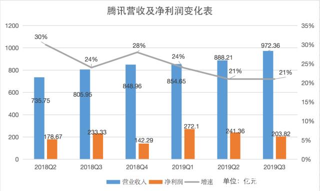 騰訊財報顯示,2019年第三季度營收972億元,同比增長20.6%,低于市場預(yù)期的990.4億元,增速與上季度持平;第三季度,公司股東應(yīng)占利潤,即凈利潤203億元,同比下降13%,低于市場預(yù)期的235.3億元。