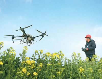 3月6日,江蘇省南通市通州區(qū)劉橋鎮(zhèn)無人農(nóng)機示范基地,種植戶在田間操控調(diào)試植保無人機。許叢軍攝(人民視覺)