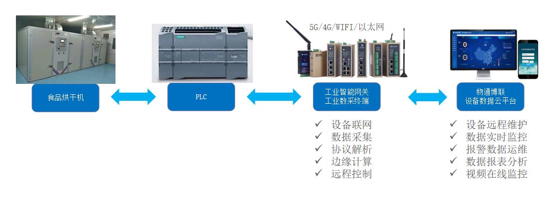 為解決這些問題,物通博聯(lián)提供以工業(yè)智能網(wǎng)關(guān)為中心構(gòu)建的糧食烘干機遠程監(jiān)控智能管理系統(tǒng)。通過將糧食烘干機的控制器PLC接入網(wǎng)關(guān),實時采集設(shè)備運行狀態(tài)、工藝參數(shù)、報警信息等數(shù)據(jù)。這些數(shù)據(jù)經(jīng)由5G/4G/WIFI/以太網(wǎng)等通信方式上傳至設(shè)備運維管理平臺,實現(xiàn)對糧食烘干機的遠程集中監(jiān)控與智能化管理。