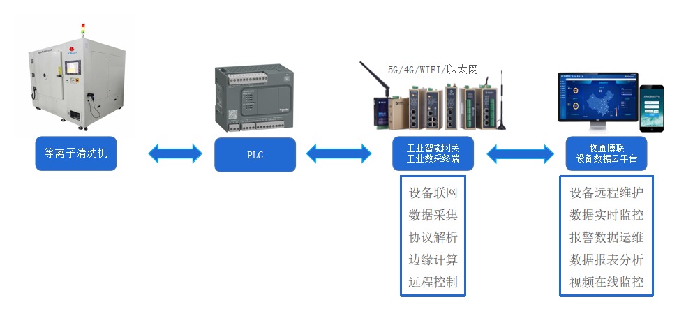 對此,物通博聯(lián)提供以工業(yè)智能網(wǎng)關(guān)為核心的等離子清洗機PLC數(shù)據(jù)采集遠(yuǎn)程監(jiān)控系統(tǒng)方案。通過將網(wǎng)關(guān)連接PLC,能夠?qū)崟r采集PLC內(nèi)部的各種數(shù)據(jù),包括模擬量、數(shù)字量、開關(guān)量等,如等離子功率、氣體流量、真空度等參數(shù)。隨后以5G/4G/WIFI/以太網(wǎng)等方式對接到云平臺或上位機中,從而工廠、設(shè)備制造商制定決策提供全面可靠的數(shù)據(jù)支持。