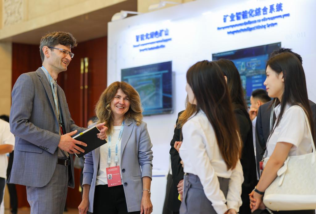 7月11日,參會嘉賓在2025上合組織數(shù)字經(jīng)濟(jì)論壇互動(dòng)體驗(yàn)區(qū)與參展企業(yè)工作人員交流。新華社記者 孫凡越 攝