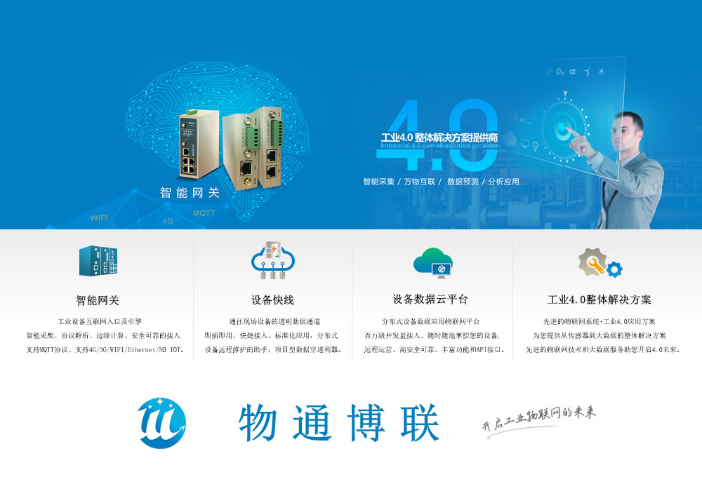 物通博聯(lián)是一家工業(yè)物聯(lián)網(wǎng)產(chǎn)品以及工業(yè)4.0解決方案提供商,專(zhuān)注于智能設(shè)備、智能工業(yè)以及行業(yè)(水務(wù)、電力、市政、樓宇、農(nóng)業(yè)、油井礦山)等領(lǐng)域提供物聯(lián)終端、智能網(wǎng)關(guān)、設(shè)備快線(xiàn)及應(yīng)用于平臺(tái)等智能化產(chǎn)品及應(yīng)用方案。