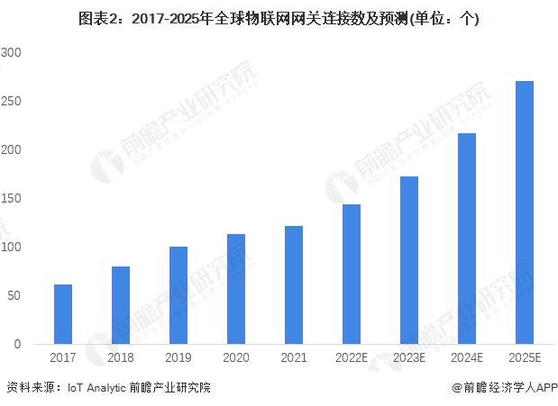 據(jù) IoT Analytic 數(shù)據(jù)顯示,截至 2021 年末全球物聯(lián)網(wǎng)連接數(shù)為 122 億,同比增速接近 8 個百分點(diǎn)。同時,根據(jù) IoT Analytic 的預(yù)測,預(yù)計到 2025 年,全球物聯(lián)網(wǎng)網(wǎng)關(guān)連接數(shù)將達(dá)到 270 億左右。