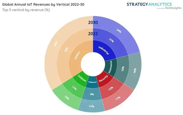 報告指出,到 2030 年,工業(yè)(24%)和汽車(16%)將繼續(xù)保持領(lǐng)先地位,其次是安防(12%),醫(yī)療保?。?1%)和公用事業(yè)(10%)。